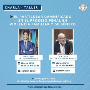 Charla- Taller: “El particular damnificado en el proceso penal en violencia familiar y de género”El Dr. Gonzalo Gassull y el Dr. Claudio Néstor Acosta disertarán sobre esta temática el martes 18 y el martes 25 de octubre de 16 a 18 hs, vía sistema Zoom. Se entregarán certificados de asistencia. LEER MÁS |