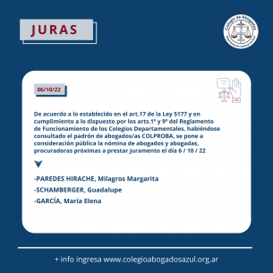 Acto de Jura de nuevas matriculadas y matriculadosEl jueves 6 de octubre a las 13hs, con modalidad presencial en la sede de Azul (Av. Perón 514) y transmisión vía YouTube; las autoridades del Colegio de Abogados Departamental tomarán juramento a las abogadas y abogados cuya nómina ponemos en consideración pública... LEER MÁS |