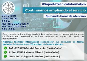 Soporte Técnico Informático al servicio de matriculadas y matriculadosSin costo, podés consultar sobre utilización del token, problemas con nuevas solicitudes de certificado con renovación, archivos adjuntos e ingreso al portal de notificaciones. LEER MÁS |