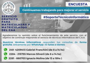 Encuesta para mejorar el servicio de técnicos informáticos del C.A.AA los fines de continuar mejorando el servicio de técnicos informáticos del C.A.A. compartimos una encuesta agradeciendo que matriculadas y matriculados nos den su opinión sobre el funcionamiento del mismo. LEER MÁS |