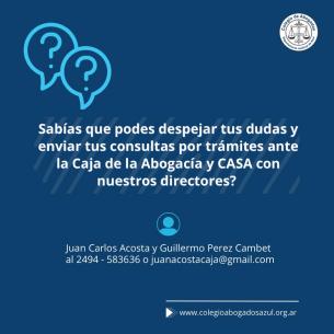 Hacé tus consultas a la Caja de la AbogacíaEnvía tus consultas a los Directores de la Caja. Podes hacerlo al 2494 583636 o enviando un correo a juanacostacaja@gmail.com LEER MÁS |