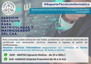 Continuamos ampliando el Soporte Técnico InformáticoEste beneficio está a disposición de nuestras matriculadas y matriculados, sin costo, para que puedan consultar sobre utilización del token, problemas con nuevas solicitudes de certificado con renovación, archivos adjuntos e ingreso al portal de notificaciones. LEER MÁS |