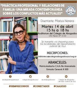 Curso: “Práctica profesional y relaciones de familia”La Dra. Marisa Herrera, destacada especialista en Derecho de Familia, disertará el martes 14/04 de 15 a 18hs en la sede del Colegio de Abogados Departamental (Av. Perón 514, Azul). Se transmitirá por sistema streaming para que matriculadas y matriculados de todas las localidades del Departamento Judicial puedan asistir en forma virtual. Se entregarán certificados de asistencia. Inscripciones: biblioteca@colegioabogadosazul.org.ar LEER MÁS |
