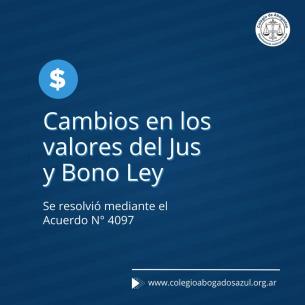 Cambios en los valores del JUS y el Bono LeyA raíz del Acuerdo de la SCJBA N° 4097, mediante el cual se establece el nuevo valor del jus arancelario en $ 7.107, y en función de lo resuelto por el Consejo Superior, se informan también los nuevos valores del Bono Ley 8480, vigentes desde el 1 de marzo de 2023: el Bono Verde costará $ 3.550 mientras que el Bono Azul $ 1.770. LEER MÁS |