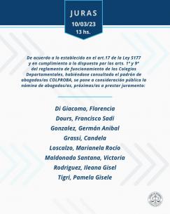 Acto de Jura de nuevas matriculadas y matriculadosEl viernes 10 de marzo a las 13 hs, con modalidad presencial en la sede de Azul (Av. Perón 514) y transmisión vía YouTube; las autoridades del Colegio de Abogados Departamental tomarán juramento a las abogadas y abogados cuya nómina ponemos en consideración pública... LEER MÁS |