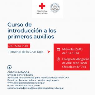 Curso de introducción a los primeros auxiliosEl Colegio de Abogados del Departamento Judicial de Azul con la colaboración de la Cruz Roja Argentina, ha organizado un Curso sobre "Introducción a los Primeros Auxilios" que se realizará el 22 de marzo de 15:00 a 19:00 hs. Se desarrollará en la Sede Tandil del Colegio de Abogados de Azul (Chacabuco 744). LEER MÁS |