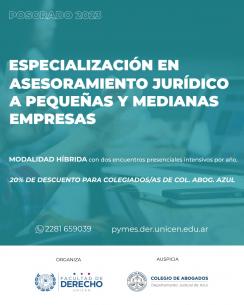 Matriculados al C.A.A. pueden inscribirse a posgrados con descuentoContinúa abierta la inscripción para la oferta de posgrados de la Facultad de Derecho de la UNICEN. Entre las propuestas, los matriculados y matriculadas pueden cursar: Especialización en asesoramiento jurídico a pequeñas y medianas empresas, especialización en protección de derechos de niñas, niños y adolescentes y diplomatura universitaria superior en estudios de géneros y estrategias de intervención en políticas públicas. En todos los casos se realiza un descuento del 20%. LEER MÁS |
