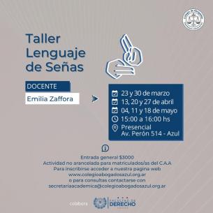 Nueva propuesta: Taller de Lenguaje de SeñasEl Colegio de Abogados del Departamento Judicial de Azul en colaboración con la Facultad de Derecho de la UNICEN ha organizado un taller de lenguaje de señas, que comenzará el 23 de marzo en la sede del C.A.A. a partir de las 15 horas y estará a a cargo de Emilia Zaffora. LEER MÁS |