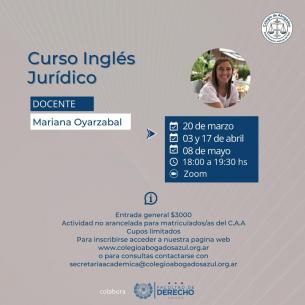 Curso Inglés JurídicoEl Colegio de Abogados del Departamento Judicial de Azul en colaboración de la Facultad de Derecho de la UNICEN ha organizado un curso sobre inglés jurídico , que comenzará el 20 de marzo y se extenderá hasta la primera semana de mayo. Se realizará utilizando la plataforma de videoconferencias Zoom y se realizarán 4 encuentros de 1 hora 30 minutos. LEER MÁS |