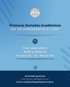 Primeras Jornadas Académicas Ley de Honorarios N° 14.967El Colegio de Abogados del Departamento Judicial de Azul organiza este encuentro académico para reflexionar y debatir sobre los alcances de la Ley de Honorarios, a casi 8 años de su implementación. La actividad se llevará a cabo el jueves 11 de septiembre de 2025, en el horario de 16 a 19 horas, de manera presencial en la sede del Colegio de Abogados del Departamento Judicial de Azul. LEER MÁS |