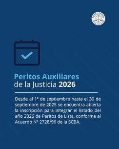 Inscripción abierta: Peritos Auxiliares de la Justicia 2026Desde el 1º de septiembre hasta el 30 de septiembre de 2025 se encuentra abierta la inscripción para integrar el listado del año 2026 de Peritos de Lista, conforme al Acuerdo Nº 2728/96 de la SCBA, reglamentado por el “Reglamento para la confección de listas y designaciones de oficio de Profesionales Auxiliares de Justicia”. LEER MÁS |
