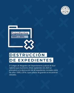 Destrucción de expedientes del Tribunal de Trabajo Nº 1 del Departamento Judicial de AzulEl Colegio de Abogados del Departamento Judicial de Azul informa que el próximo 29 de septiembre de 2025 se procederá a la destrucción de 66 expedientes iniciados entre los años 1999 y 2014, cuyos plazos de guarda se encuentran vencidos. LEER MÁS |