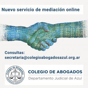 Nuevo servicio de mediación online del Colegio de Abogados de AzulEl Colegio de Abogados del Departamento Judicial de Azul ha puesto en funcionamiento el Servicio de Mediación Voluntaria a Distancia online, como una alternativa concreta, eficaz, rápida y oportuna de resolución de conflictos. Surgió de la iniciativa de las/os mediadores matriculadas/os del Colegio de Abogados Departamental con el apoyo de su Consejo Directivo. LEER MÁS |