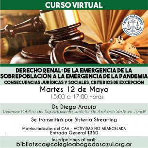 Curso: “Derecho Penal: De la emergencia de la sobrepoblación a la emergencia de la pandemia”El Dr. Diego Araujo, Defensor público del Departamento Judicial de Azul con sede en Tandil, abordará las “Consecuencias jurídicas y sociales, criterios de excepción” el martes 12/05 de 15 a 17hs, vía streaming. Inscripciones. biblioteca@colegioabogadosazul.org.ar LEER MÁS |