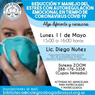 Charla: “Reducción y Manejo del Estrés con Autoregulación Emocional..."El lunes 11/05 de 15 a 16hs te proponemos algo diferente y necesario… Junto al Lic. Diego Nuñez (Especialista Psicólogo Educacional. Psic. de la Emergencia, Víctimas Directas e Indirectas y Manejo del Estrés) obtendremos nuevas herramientas para afrontar la compleja situación actual. Esta charla es exclusiva para matriculadas y matriculados. Cupos Limitados. LEER MÁS |