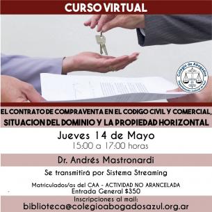 Charla: “El contrato de compraventa en el Código Civil y Comercial..."El Dr. Andrés Mastronardi disertará sobre esta temática el jueves 14/05 de 15 a 17hs, vía streaming. La capacitación es no arancelada para matriculadas y matriculados. Inscripciones. biblioteca@colegioabogadosazul.org.ar LEER MÁS |