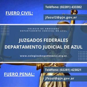 Inicio de causas y presentaciones electrónicas en el Fuero Federal.La Cámara Federal de Apelaciones de Mar del Plata (CFAMDP), de la que depende el Juzgado Federal de Azul, ha dictado la Resolución 38/2020 por la cual amplía materias para el Inicio de causas en Feria extraordinaria por COVID. LEER MÁS |