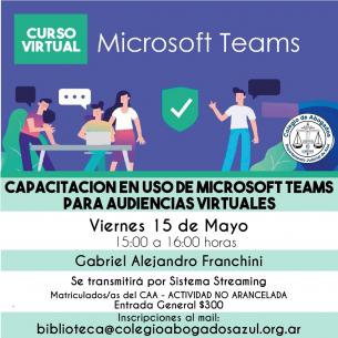 Capacitación en uso de Microsoft Team para audiencias virtualesEl Técnico en Informática Gabriel Alejandro Franchini, explicará como bajar la aplicación y como usarla, en celulares, tablets y computadoras. Será el viernes 15/05 de 15 a 16hs, vía streaming. Inscripciones: biblioteca@colegioabogadosazul.org.ar LEER MÁS |