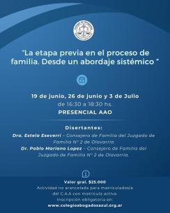 Curso de actualización sobre la etapa previa en el proceso de familiaContará con la disertación de los consejeros de familia del Juzgado de Familia Nro 2 de Olavarría Estela Eseverri y Pablo Mariano López. Comenzará el 19 de junio y se extenderá hasta el 3 de julio de 16.30 a 18.30 hs. LEER MÁS |
