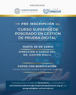Preinscripción al curso de posgrado en gestión de prueba digitalHasta el 30 de junio se podrán inscribir a la mencionada capacitación que tendrá una duración de un año y comenzará el próximo agosto. LEER MÁS |