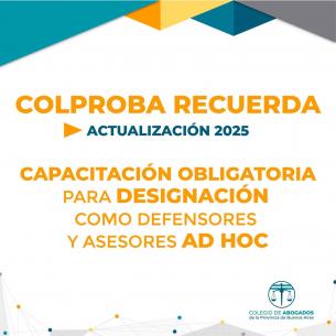 COLPROBA recuerda información sobre la capacitación obligatoria de defensores y asesores ad-hocConforme lo dispuesto por el Acuerdo 4061/22 de la SCBA, el curso de "Actualización 2025" ha adquirido carácter de obligatorio a partir del 1ro de junio para quienes deseen ser designados/as como defensores/as o asesores/as de incapaces ad hoc ante la justicia de paz. LEER MÁS |