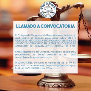 Llamado a convocatoriaEl Colegio de Abogados del Departamento Judicial de Azul realiza el llamado para para cubrir UN (1) CARGO DE ABOGADA/O ENCARGADA/O DEL AREA DE ASUNTOS DISCIPLINARIOS EN LA SEDE DEL COLEGIO DE ABOGADOS DEL DEPARTAMENTO JUDICIAL DE AZUL. LEER MÁS |