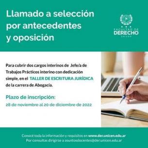 Llamado de antecedentes y oposición para la cobertura de 2 cargos interinosLa Facultad de Derecho de la UNICEN realiza esta convocatoria para cubrir dos cargos de Jefe/a de Trabajos Prácticos interino con dedicación simple, para el Taller de Escritura Jurídica de la carrera de Abogacía, a partir del 1 de marzo de 2023. El plazo de inscripción finaliza el próximo 20/12/22. LEER MÁS |