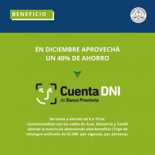 En diciembre aprovechá un 40% de ahorro con Cuenta DNIDe lunes a viernes de 8 a 19hs comunicándote con las sedes de Azul, Olavarría y Tandil abonás la matrícula obteniendo este beneficio (con un tope de reintegro unificado de $2.000 por vigencia, por persona). LEER MÁS |