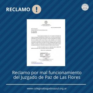 Reclamo por mal funcionamiento del Juzgado de Paz de Las FloresDesde nuestro Colegio de Abogados Departamental se elevó nota a la presidenta de la SCBA, Dra. Hilda Kogan, a los fines de hacerle llegar la problemática que hemos tomado conocimiento a través de matriculados de la localidad. LEER MÁS |