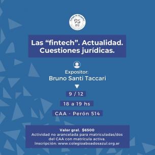 El Colegio organizó una charla sobre cuestiones jurídicas de las fintechEstará a cargo de Bruno Santi Taccari quien se presentará en la sede del Colegio en Av. Perón 514 el próximo 9 de diciembre a las 18 hs. LEER MÁS |