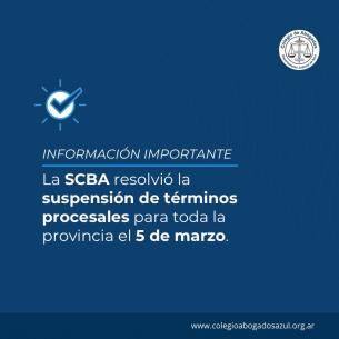 La SCBA resolvió la suspensión de términos procesales para toda la provincia el 5 de marzoA partir de la solicitud de COLPROBA, la SCBA dio a conocer la decisión de suspender términos procesales frente a las fallas que se produjeron en la infraestructura de firma electrónica de la Suprema Corte. LEER MÁS |