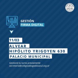 Información importante sobre renovación de firma digital en AlvearEl 11 de marzo, personal del Colegio de Abogados Departamental estará presente en la localidad para facilitar la gestión de firma digital a las/os matriculadas/os. Se solicita a quienes deban renovar su firma digital que soliciten su turno al mail: secretaria@colegioabogadosazul.org.ar LEER MÁS |