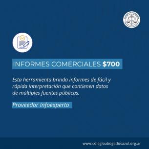 Novedades sobre el servicio de informes comercialesEl valor de este servicio es de $700, vigente desde el 5 de marzo, y podés solicitar el proveedor Infoexperto. LEER MÁS |