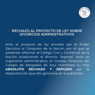 Rechazo al proyecto de ley sobre divorcios administrativosEl Consejo Directivo del Colegio de Abogados del Departamento Judicial de Azul expresa su más absoluto rechazo y repudio al proyecto de ley enviado por el Poder Ejecutivo Nacional al Congreso donde se pretende reformar el Código Civil y Comercial de la Nación, propiciando el divorcio “express” ante un organismo administrativo. LEER MÁS |