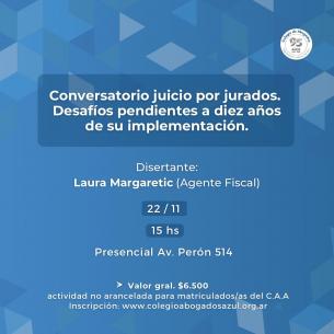 El Colegio organizó un conversatorio sobre juicios por juradosEstará a cargo de la agente fiscal Laura Margaretic quien se presentará en la sede del Colegio en Av. Perón 514. Se realizará el próximo 22 de noviembre a las 15 hs. LEER MÁS |