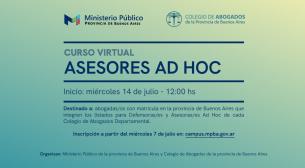 Curso virtual para “Asesores Ad Hoc”En el marco del convenio de cooperación conjunta entre el Ministerio Público de la provincia de Buenos Aires y el Colegio de Abogados de la provincia de Buenos Aires, se ha elaborado un curso virtual para Asesores Ad Hoc, que estará disponible a partir del miércoles 14 de julio de 2021. LEER MÁS |