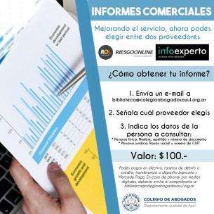 Informes comerciales: Mejorando el servicio, ahora podés elegir entre dos proveedores.Esta completa herramienta muy útil para el desempeño de la profesión, brinda informes de fácil y rápida interpretación que contienen datos de múltiples fuentes públicas. El valor de este servicio es de $100, vigente desde el 1/07/20. Podrás elegir entre dos proveedores: Riesgo On Line o Infoexperto. LEER MÁS |