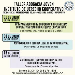 Taller Abogacía Joven - Instituto de Derecho CooperativoEste jueves 15 de julio se concretará la última de tres jornadas abordando la temática “Incumbencias profesionales del abogado en el ámbito cooperativo”, vía Zoom. Esta capacitación es no arancelada para matriculados/as del C.A.A y no requiere inscripción previa. LEER MÁS |