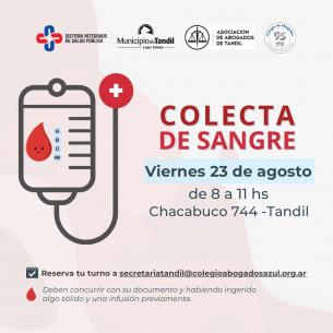 Colecta de Sangre en la Subsede de TandilEl viernes 23 de agosto se realizará una colecta de sangre voluntaria en la Subsede del Colegio de Tandil (Chacabuco 744). LEER MÁS |