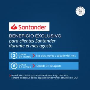 Beneficio exclusivo para clientes Santander durante el mes de agostoEl Colegio ofrece a matriculados/as que sean clientes del Banco Santander la posibilidad de abonar cursos, token, matrícula, etc. con beneficios exclusivos todos los meses. En agosto pueden aprovechar 3 cuotas sin interés cada jueves y sábado del mes y 6 cuotas sin interés el sábado 31 de agosto. LEER MÁS |