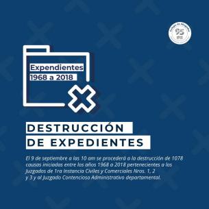 Nueva jornada de destrucción de expedientes programada para el 9 de septiembreEl 9 de septiembre a las 10 am se procederá a la destrucción de 1078 causas iniciadas entre los años 1968 a 2018 con plazos de guarda vencidos. LEER MÁS |