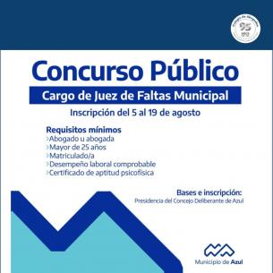 Llamado a concurso público para desempeñarse en el cargo de Juez de FaltasHasta el lunes 19 está abierta la convocatoria para participar del concurso público para cubrir el cargo de Juez de Faltas del partido de Azul. LEER MÁS |
