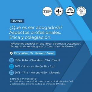 Ciclo de Charlas sobre aspectos profesionales de la abogacíaEstará a cargo del Dr. Horacio Vero y comenzará el 19 de agosto en Tandil. La jornada continuará el 20 de agosto en Azul y en Olavarría. LEER MÁS |
