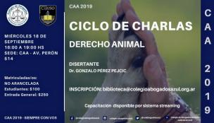 Ciclo de Charlas: Derechos Reales, Derecho Ambiental y Derecho AnimalEl miércoles 18 de septiembre de 16 a 19hs en la sede del Colegio de Abogados Departamental, el Dr. Gonzalo Pérez Pejcic disertará sobre Derecho Animal, en el marco de este ciclo de capacitaciones no aranceladas para matriculadas y matriculados del CAA, que comenzaron en agosto. Será transmitida por Sistema Streaming para facilitar la participación de profesionales de todas las localidades del Departamento Judicial. Inscripciones por mail: biblioteca@colegioabogadosazul. LEER MÁS |