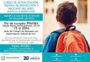Curso de Actualización: “Sistema de protección y Abogado del Niño. Justicia y Derechos.”Desde el próximo 24/09 al 10/12 inclusive se brindará esta capacitación que habilita a inscribirse al listado de Abogado del Niño, organizada por la Facultad de Derecho de la UNICEN y el Colegio de Abogados del Departamento Judicial de Azul. Se cursará los martes de 15 a 20hs. Valor del curso: $4500. Inscripciones: biblioteca@colegioabogadosazul.org.ar LEER MÁS |