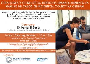 Capacitación “Cuestiones y conflictos jurídicos urbano-ambientales”El Dr. Daniel F. Soria, Ministro de la Suprema Corte de la provincia de Buenos Aires disertará sobre esta temática el lunes 16 de septiembre de 15 a 19hs en el Auditorio de la Cámara Empresaria de Tandil (Mitre 856). La actividad es no arancelada para matriculadas y matriculados del Colegio de Abogados Departamental, miembros del Poder Judicial y estudiantes de Derecho. Inscripciones al mail: biblioteca@colegioabogadosazul.org.ar LEER MÁS |