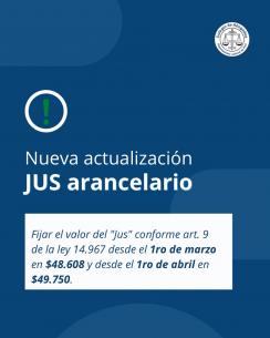 Nueva actualización del valor del JUS aplicable a marzo y abrilSe definió mediante el Acuerdo 4222 de la SCBA. Allí se establece el nuevo valor desde el 1ro de marzo en $48.608 y desde el 1ro de abril en $49.750. Asimismo, se estableció el nuevo valor del jus arancelario decreto ley en $33.998. LEER MÁS |