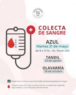 Colecta de sangre en las localidades del ColegioEn los próximos meses se realizará una colecta voluntaria de sangre en la Sede y Subsedes del Colegio, ubicadas en Olavarría, Tandil y Azul. La jornada comenzará en Azul el próximo 21 de mayo. LEER MÁS |