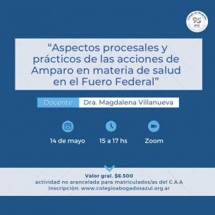 Capacitación: Aspectos procesales y prácticos de las acciones de amparo en salud en el Fuero FederalLa propuesta está a cargo de la Dra. Magdalena Villanueva y se realizará de manera remota a través del sistema Zoom desde las 15 hs del 14 de mayo. LEER MÁS |
