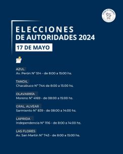 Conocé los lugares de votación para estas Elecciones de AutoridadesCompartimos el detalle de los lugares para ejercer tu voto en estas elecciones 2024. En los flyers encontrarás sus respectivos horarios y direcciones. LEER MÁS |